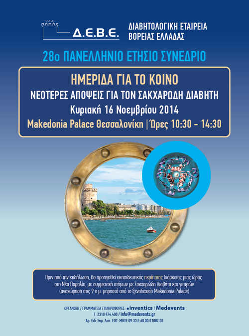 Η Διαβητολογική Εταιρεία Βορείου Ελλάδος, στα πλαίσια του 28ου Πανελλήνιου Ετήσιου Συνεδρίου της, διοργανώνει Ημερίδα για το κοινό με θέμα «Νεότερες απόψεις για τον Σακχαρώδη Διαβήτη», την Κυριακή 16 Νοεμβρίου 2014, στο ξενοδοχείο Makedonia Palace στη Θεσσαλονίκη.